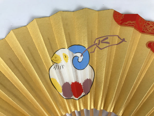 This is a miniature traditional Japanese folding fan called sensu. You can use this when it's hot or as decoration. This fan is made with a natural bamboo frame (with lacquered ends) and sturdy washi paper. It features a white and multi-color horned sheep in the shape of a clay bell (dorei) on a gold background. There is a red accent in the upper right with gold clouds. The back side is plain beige.