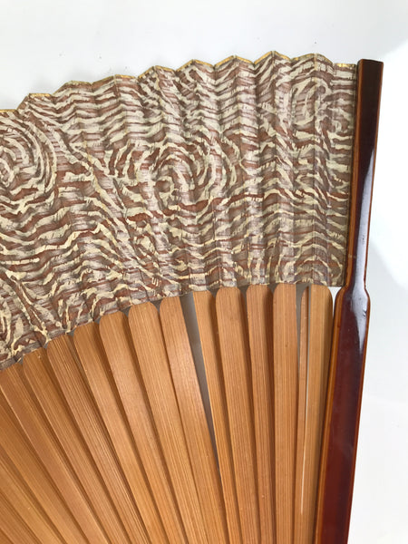 This is a traditional Japanese folding fan called sensu. You can use this when it's hot or as decoration. This fan is made with a natural bamboo frame. The front side has a brown and beige floral swirl pattern. The back side is the same design but gray/silver with beige. The flowers look like roses. The end pieces are lacquered brown in the Shunkei style.