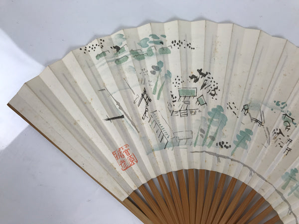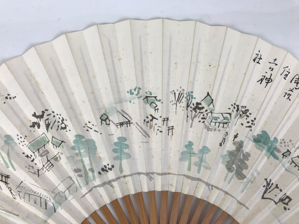This is a traditional Japanese folding fan called sensu. You can use this when it's hot or as decoration. This fan is made with a natural bamboo frame and a thick, durable paper. It features a picture of a village with houses, buildings, a shrine, and trees in green and black. There is calligraphy on the top right part.