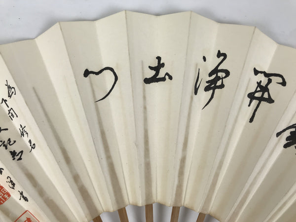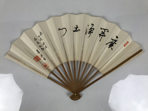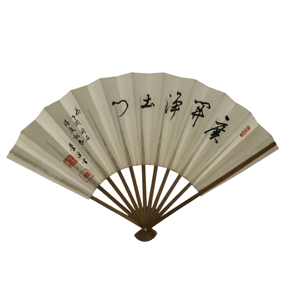 This is a traditional Japanese folding fan called sensu. You can use this when it's hot or as decoration. The front side of this paper fan features calligraphy with 5 big characters and some text on the left. There are red seals. The back side of the fan is a plain beige color. It is made with a natural bamboo frame.