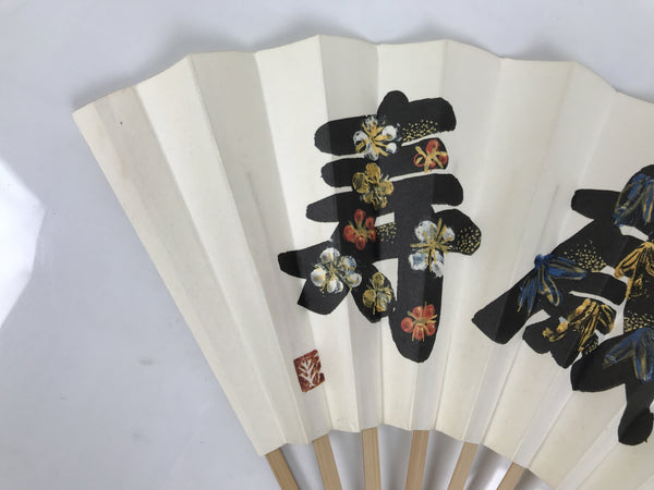 This is a traditional Japanese folding fan called sensu. You can use this when it's hot or as decoration. This decorative fan features three big black kanji characters with colored illustrations of flowers on the inside. The kanji are for prosperity and a long life. The inner frame is natural bamboo. The back of the fan is white with inscriptions on the left.