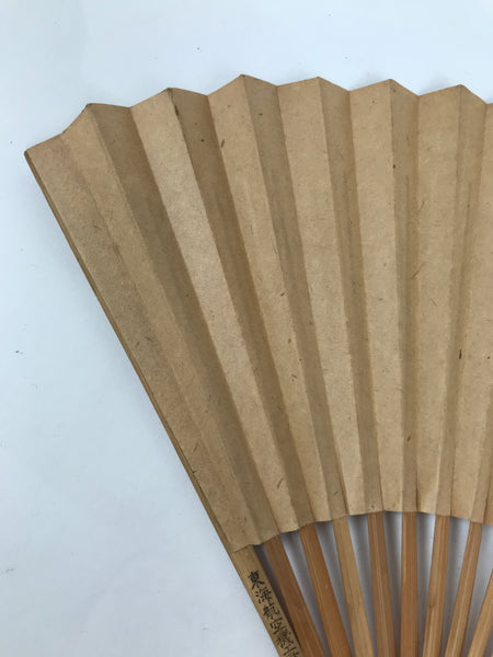This is a traditional Japanese folding fan called sensu. You can use this when it's hot or as decoration. This fan is made with a natural bamboo frame and a thick, durable paper. The paper is brown, almost like craft paper. It has a picture on the front representing a mountain and flying birds.