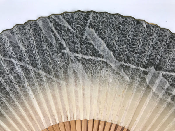 This is a traditional Japanese folding fan called sensu. You can use this when it's hot or as decoration. The front side of this paper fan features a gorgeous black/gray and beige web-like washi paper design with a bamboo branch with leaves silhouette. The back side is a plain beige color. It is made with a natural bamboo frame with decorative cutouts and has a gray string with a green glass bead attached at the bottom.