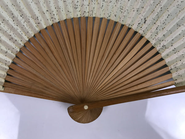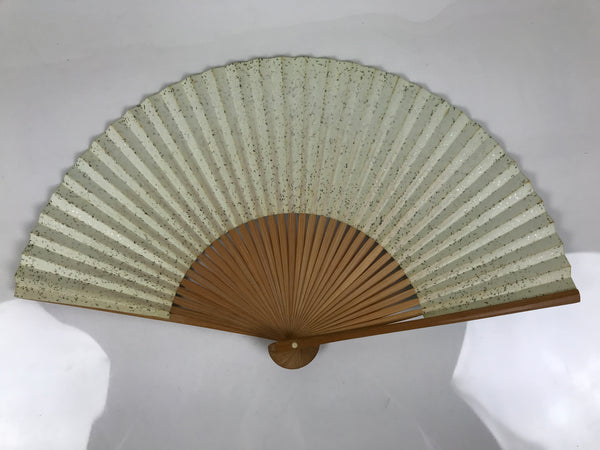 This is a traditional Japanese folding fan called sensu. You can use this when it's hot or as decoration. This fan is made with a bold teal washi paper on the front side with gold and silver lines stretching across from the left. The back side is beige with silver specks. It is made with a natural bamboo frame.