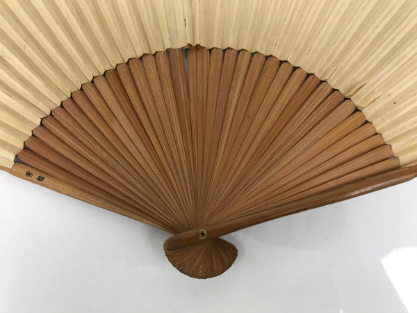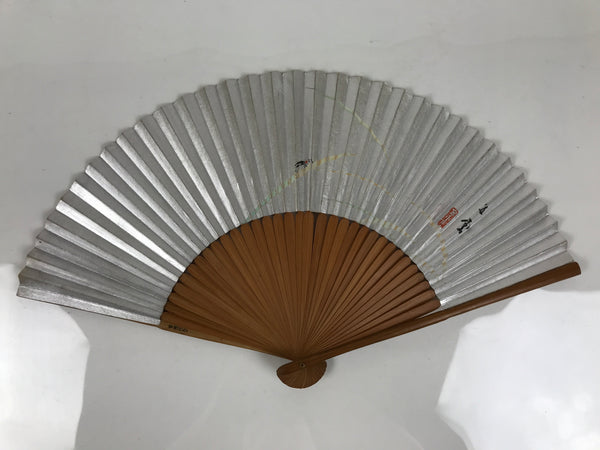 This is a traditional Japanese folding fan called sensu. You can use this when it's hot or as decoration. This fan is made with a natural bamboo frame and a thick, durable paper. It appears to have a double layer of paper, with a silvery layer on top corresponding to the front of the fan. It features a picture on the front that represents a firefly, hotaru in Japanese, resting on a leaf.