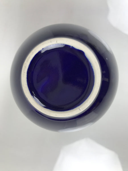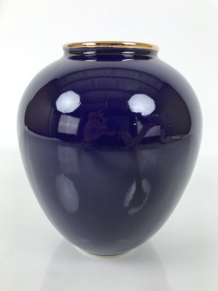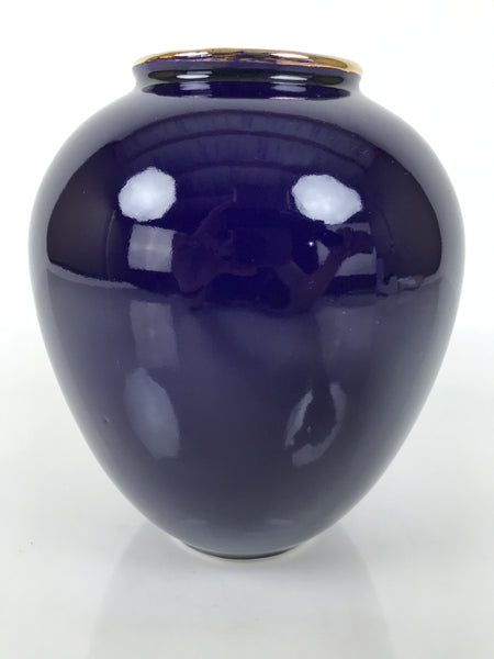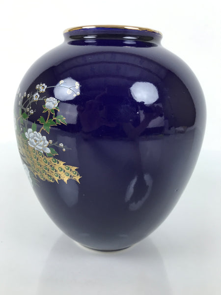 This is a vintage Japanese porcelain flower vase, or kabin. This round vase has a tapered shape. It has a glossy dark blue finish, a gold rim, and a peacock-and-flower design. The peafowls on the rocks are gold, silver, red, and green, and the white plum blossoms and peony flowers are around them.  It can be used for all types of flower arrangements, both ikebana and casual, and also as a statement piece.