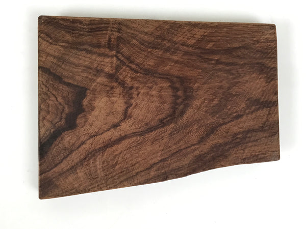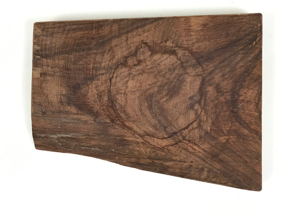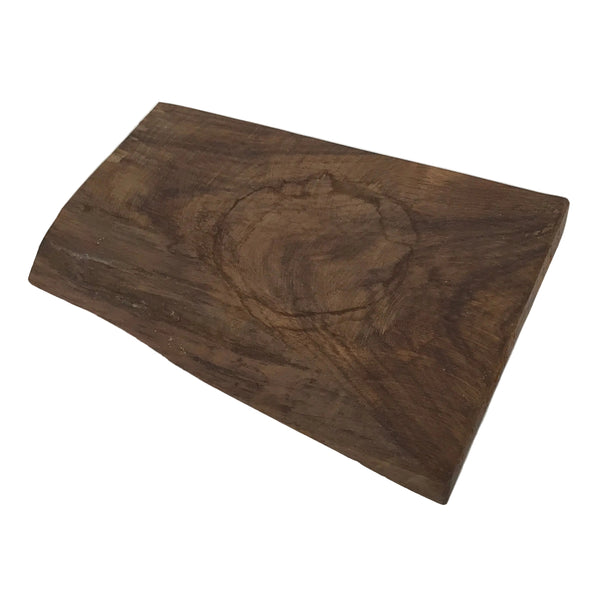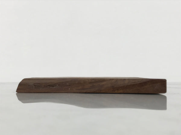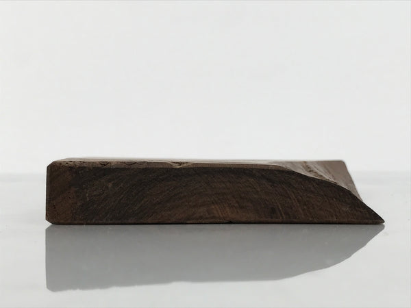 Used for the display of flower vases, ikebana arrangements, bonsai, and more, this small, uniquely shaped kadai is one-of-a-kind, handcrafted from a piece of solid wood. It is stained a muted medium brown with a clear brushed matte lacquer coating. Of the four sides, one is imperfectly sloped and has texture that lends a natural look to any ikebana arrangement.