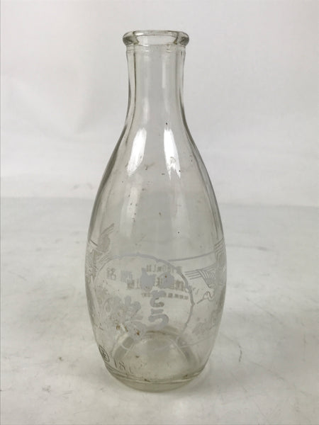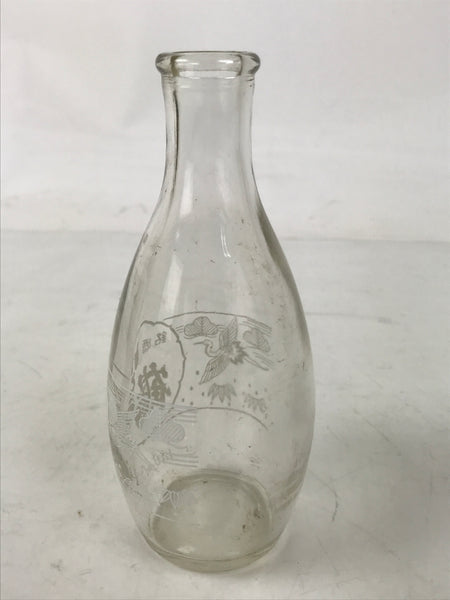 This is a Japanese vintage glass sake bottle, or Tokkuri. It is a branded bottle from the Itou Tsuru Sake Brewery in Ena City in Gifu Prefecture. It is a 180ml volume souvenir-type single-serving bottle that would have been sold at roadside stations and local shops. It has the image of cranes flying with pine tree and bamboo designs in the background. Its compact size makes it easy to use daily for beverages or as a small flower vase.