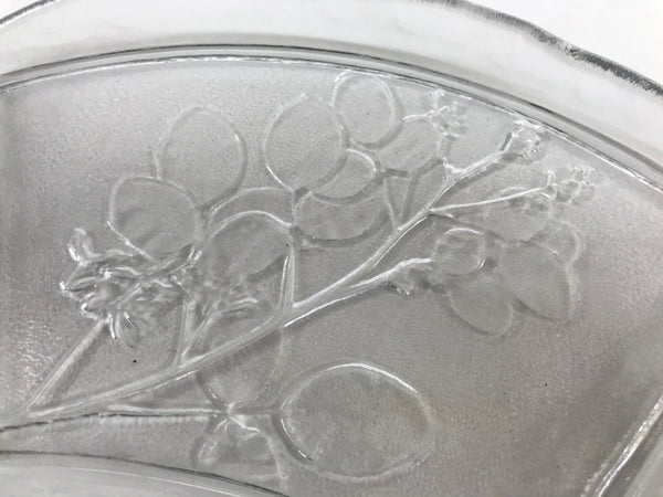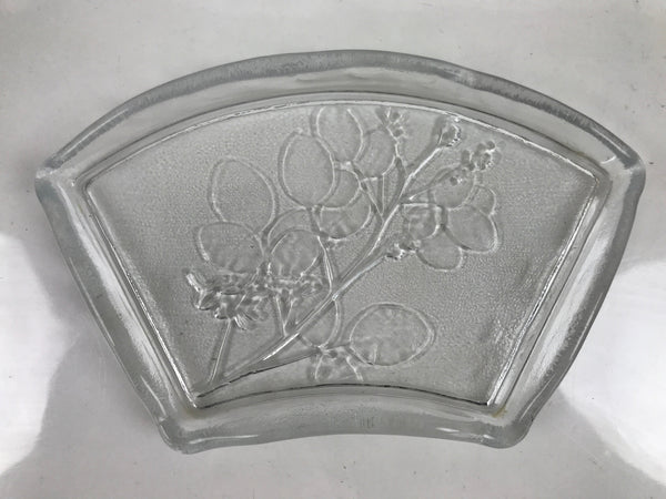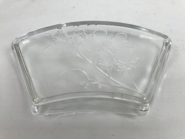This is a vintage Japanese Sasaki crystal glass plate. This fan-shaped small plate, also called kozara, is clear and features an embossed image of bush clover/Japanese clover (hagi). Kozara are often used for side dishes and serving desserts. This particular plate is most likely used for single servings of sashimi.