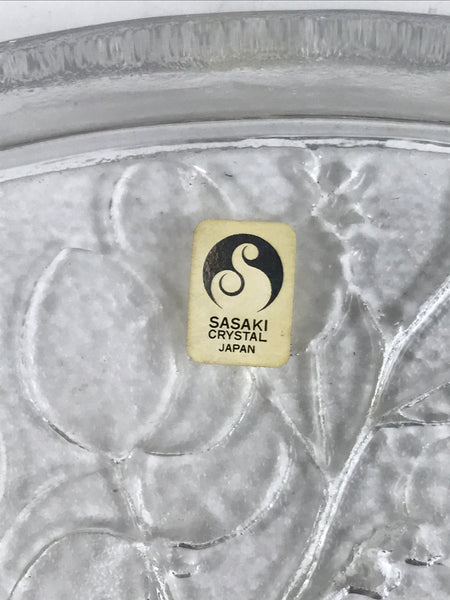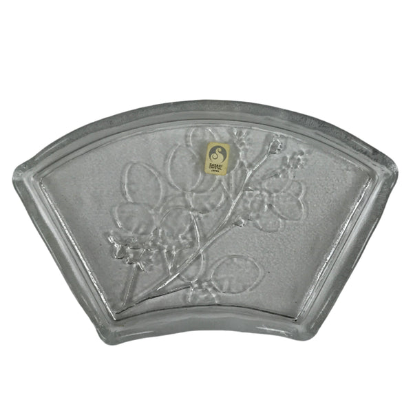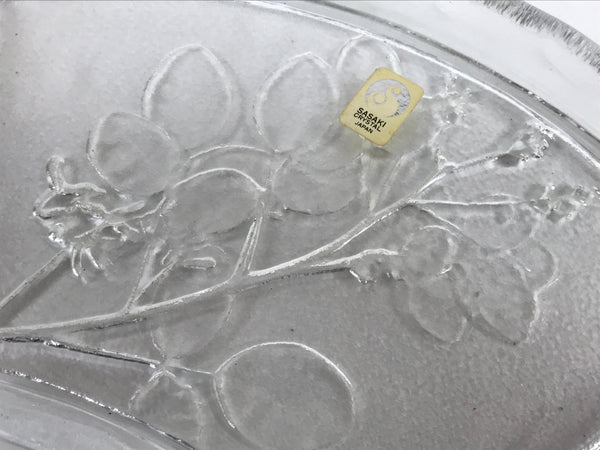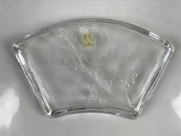 This is a vintage Japanese Sasaki crystal glass plate. This fan-shaped small plate, also called kozara, is clear and features an embossed image of bush clover/Japanese clover (hagi). Kozara are often used for side dishes and serving desserts. This particular plate is most likely used for single servings of sashimi. It has the original maker's sticker on the front.