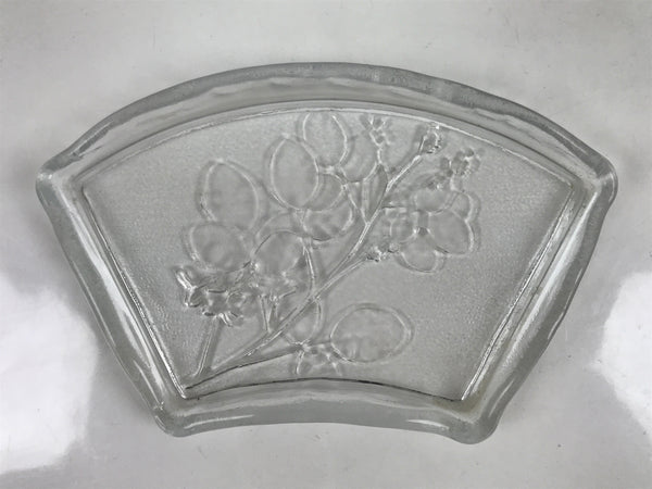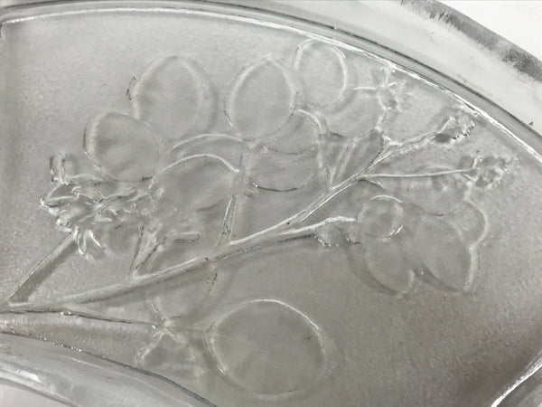 This is a vintage Japanese Sasaki crystal glass plate. This fan-shaped small plate, also called kozara, is clear and features an embossed image of bush clover/Japanese clover (hagi). Kozara are often used for side dishes and serving desserts. This particular plate is most likely used for single servings of sashimi.