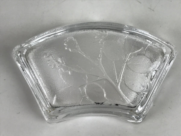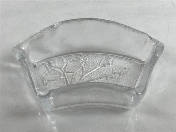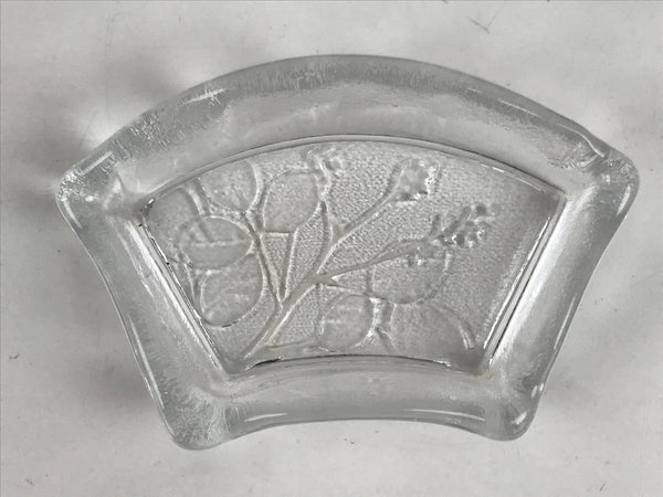 This item is a vintage Japanese serving dish in the shape of a fan. Made of Sasaki crystal, this is used for small aesthetic dishes often served during traditional multi-course kaiseki meals, as well as a dipping bowl for soy sauce and other condiments when eating sashimi. It features an embossed image of bush clover/Japanese clover (hagi).