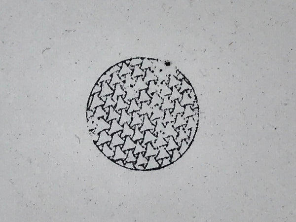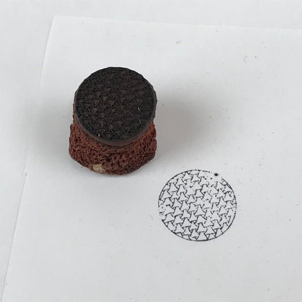 This is a Japanese vintage rubber stamp attached to a sponge-like base. The stamp features a geometric pattern of entangled triangles enclosed in a circle. The sponge base has hardened. This stamp can be used as it or you can remove the rubber to place it on another base.