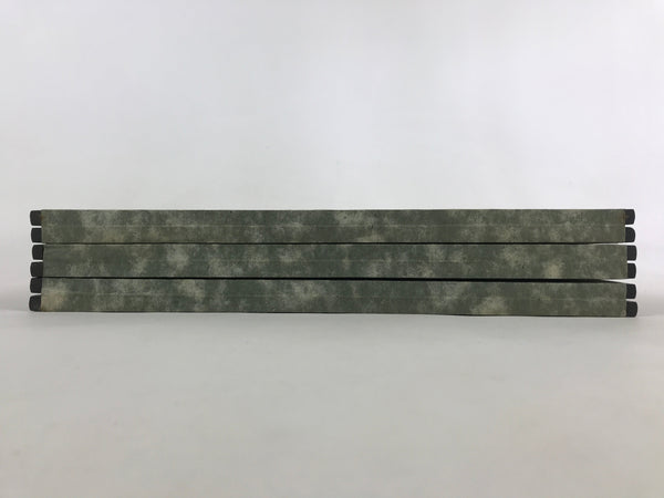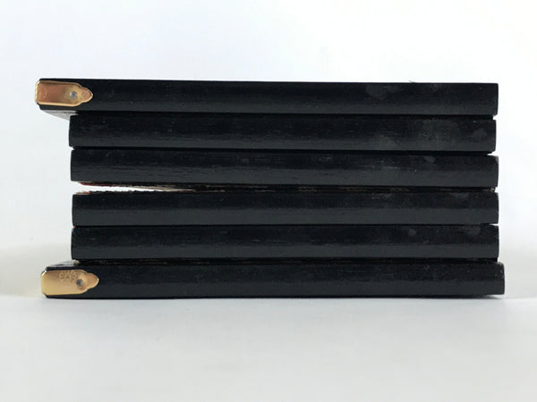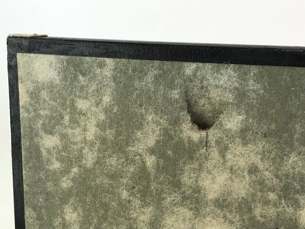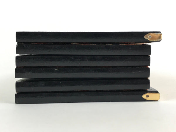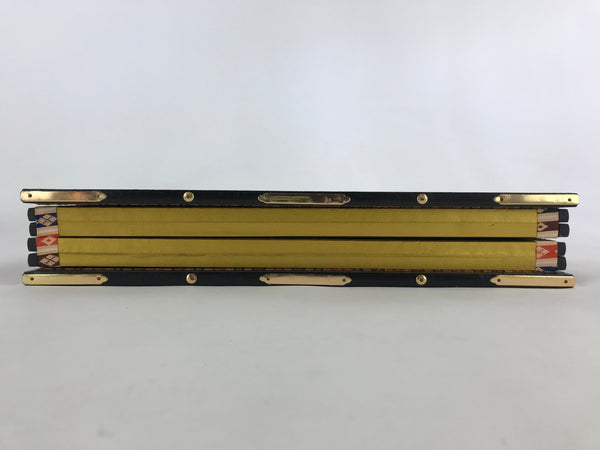 This is a vintage miniature folding screen called Byobu. The front of the panel has a gorgeous gold color and its edge is decorated with a black, blue and red pattern mimicking family crests. The back of the panel is made of Japanese washi paper and is green and beige. The whole panel has a black wooden edge embellished with gold color metal parts.