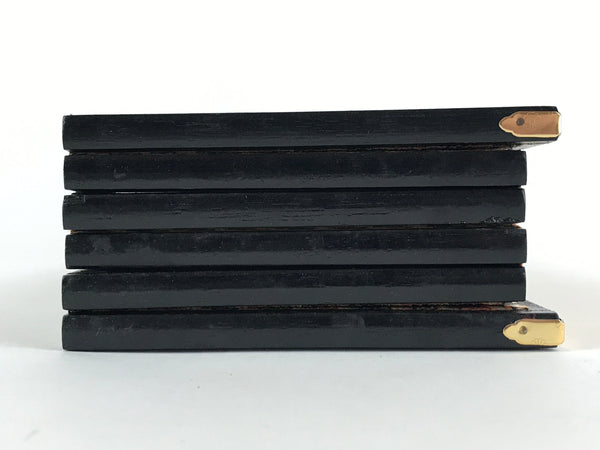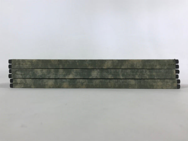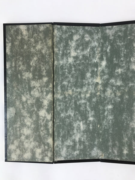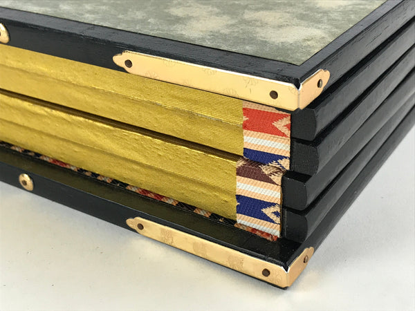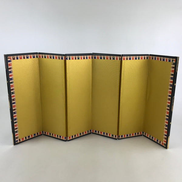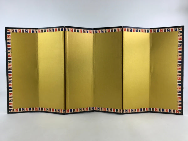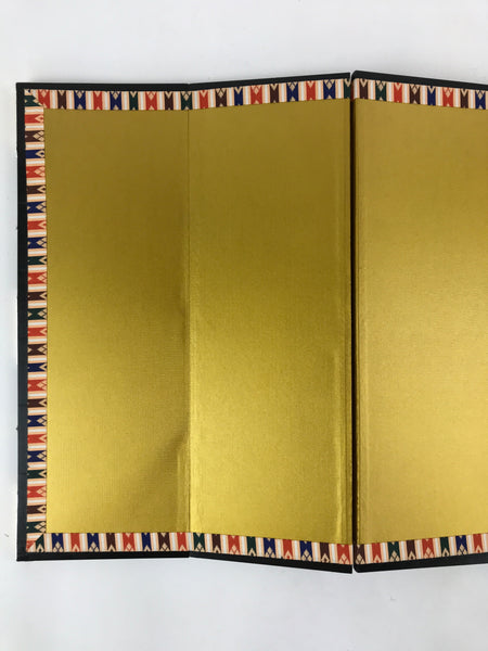 This is a vintage folding panel (Byobu). This folding screen is a miniature one, usually used as a background for displaying Hina dolls at Girl's Festival. The front of this panel has a gorgeous gold color and its edge is decorated with a black, blue and red pattern. The back of the panel is made of Japanese washi paper and is green and beige. The whole panel has a black wooden edge embellished with gold color metal parts. This is a delicate and elegant product.