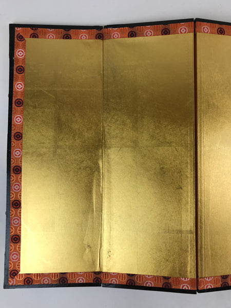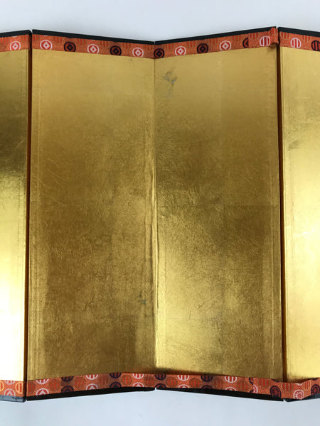 This is a vintage folding panel (Byobu). This folding screen is a miniature one, usually used as a background for displaying Hina dolls during the Girl's Day Festival. The front of this panel is covered in a gorgeous gold leaf and the fabric border is decorated with a black, blue and orange pattern.