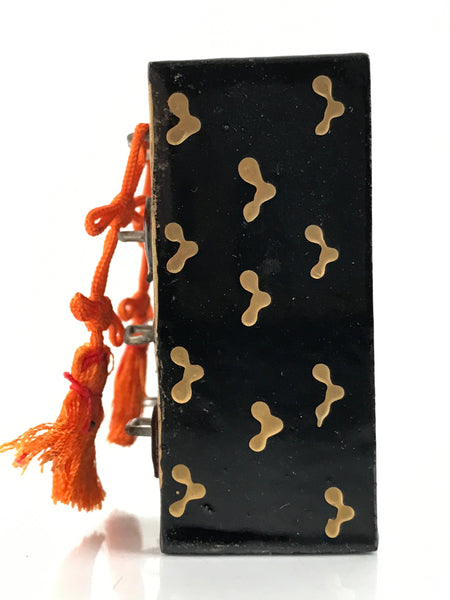 This is a Japanese vintage Hina doll furniture piece called tansu, dresser. It is painted in black with some gold decorations and has some orange tassels. The drawers can be pulled out but they are block of wood so nothing can be stored inside. This Hina dolls furniture set is a great addition to any existing set.