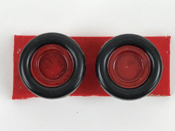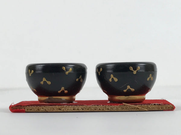 This is a Japanese vintage Hina doll furniture piece called hibachi, fire pits. It is painted in black with some gold decorations on the outside and it is red on the inside. There are actually two fire pits attached to a stand covered with a red fabric. This Hina dolls furniture set is a great addition to any existing set.
