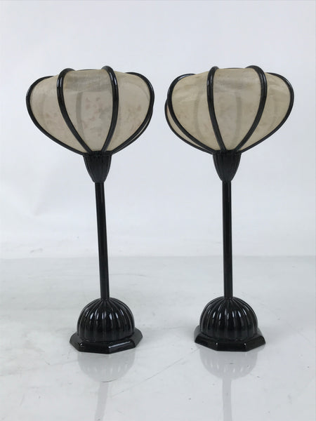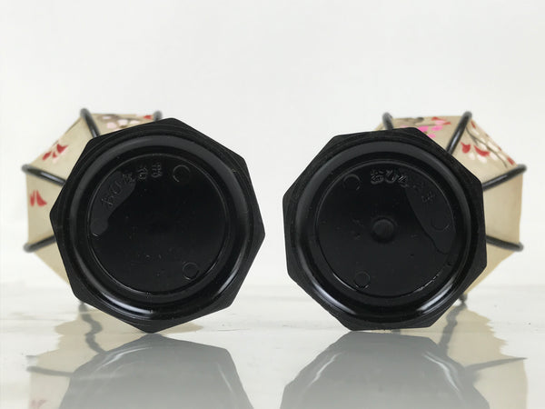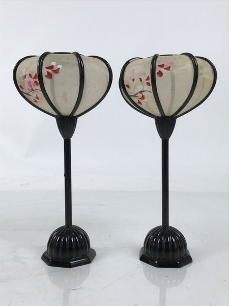 This is a vintage Hina doll furniture lantern set. A bonbori is a portable lamp traditionally used to light spaces during times without electricity (a lantern more decorative than a common brazier). This pair of lanterns sits at the top of a hina display at the ends. It is made entirely of resin and colored black. The lantern top is made of translucent white silk and has red and pink cherry blossoms hand-painted on it. It comes with the original paper box.