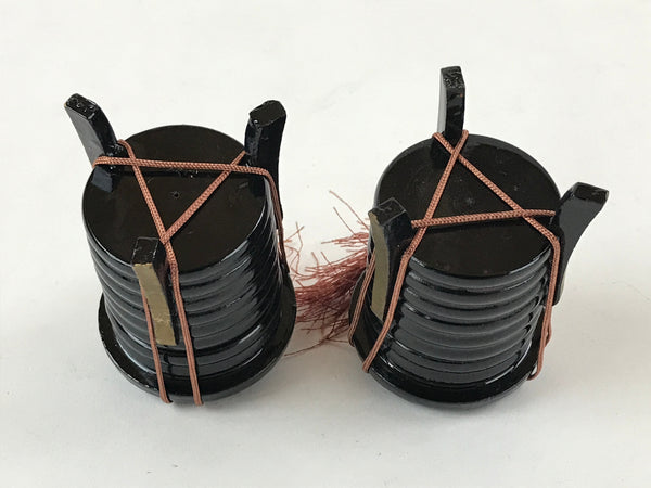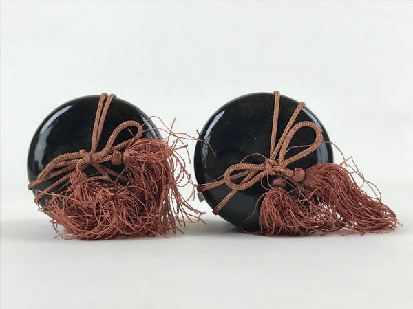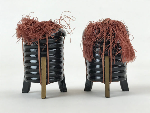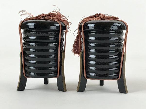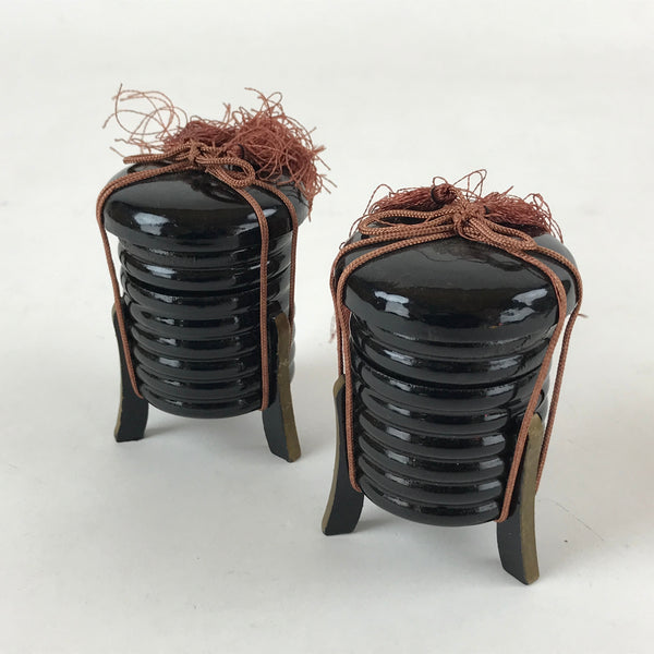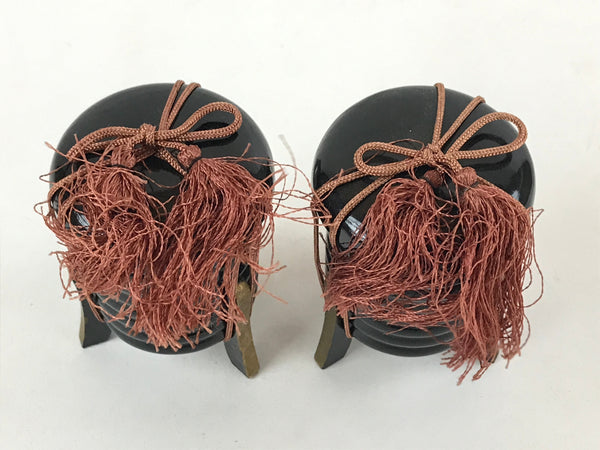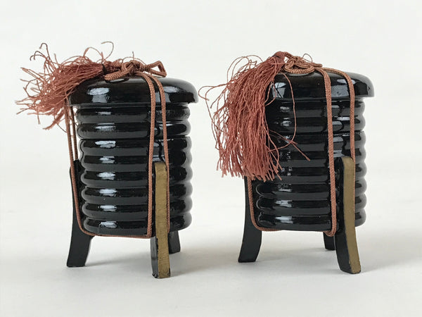 This is a Japanese vintage Hina doll furniture set of two lacquered wooden Kaioke, storage boxes for clam sheels. The boxes are black with an orange closing string topped by a tassel. The boxes can be opened. but are empty This Hina dolls furniture set is a great addition to any existing set.