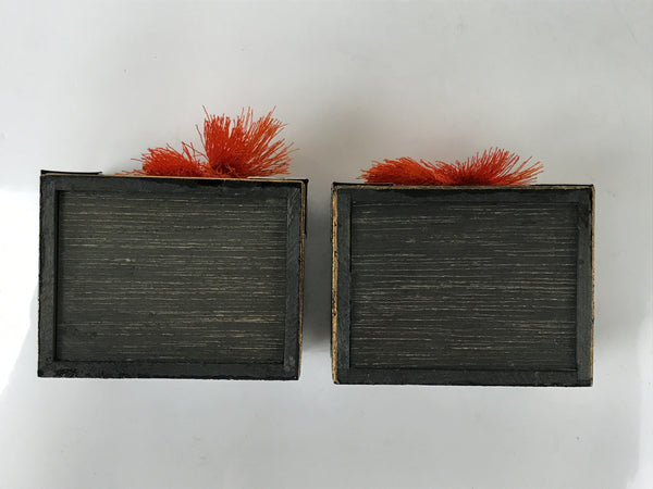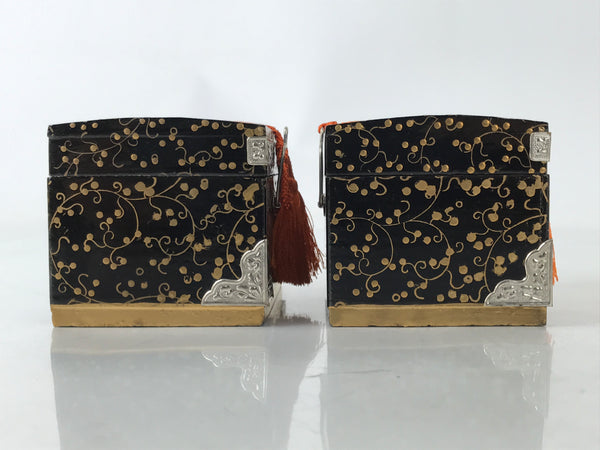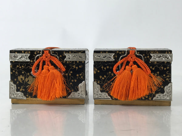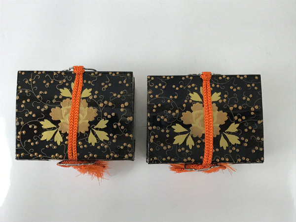 This is a pair of Japanese vintage Hina doll furniture pieces called hasamibako (traveling chest/clothes chest). They are larger than most pieces of their kind and painted in black lacquer with gold makie designs of peony flowers and vines. There is an orange braided silk cord with tassels on each. Thin metal pieces are used to decorate the front corners and edges as well. The small hardware is made of same material. They can be opened.