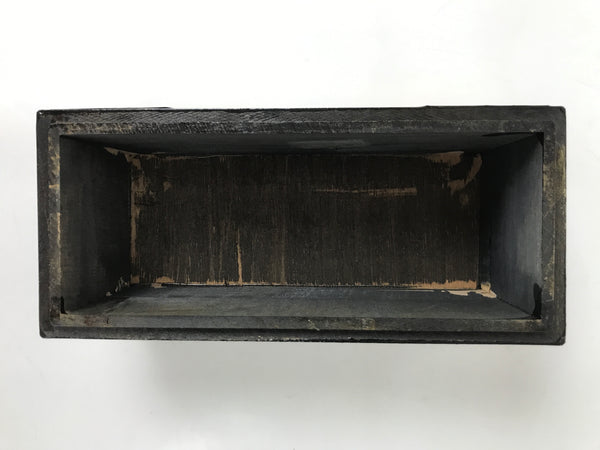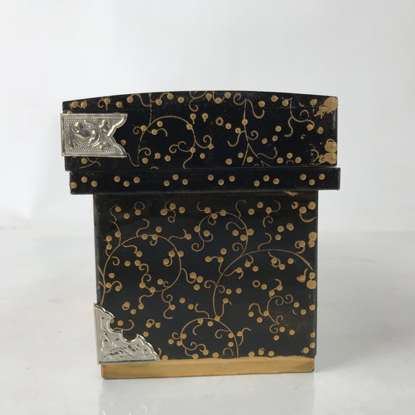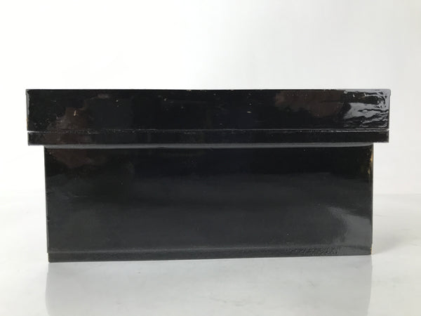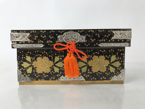 This is a Japanese vintage Hina doll furniture piece called nagamochi (storage trunk). It is larger than most pieces of its kind and painted in black lacquer with gold makie designs of peony flowers and vines. There is an orange braided silk cord with tassels. Thin metal pieces are used to decorate the front corners and edges as well. The small hardware is made of same material. It can be opened.