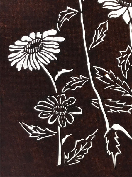 Using traditional mulberry washi paper, this katagami stencil with silk backing features a trio of blooming daisies with stems and leaves.