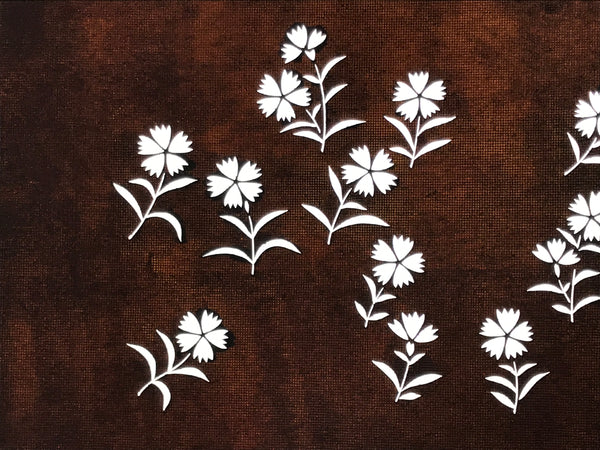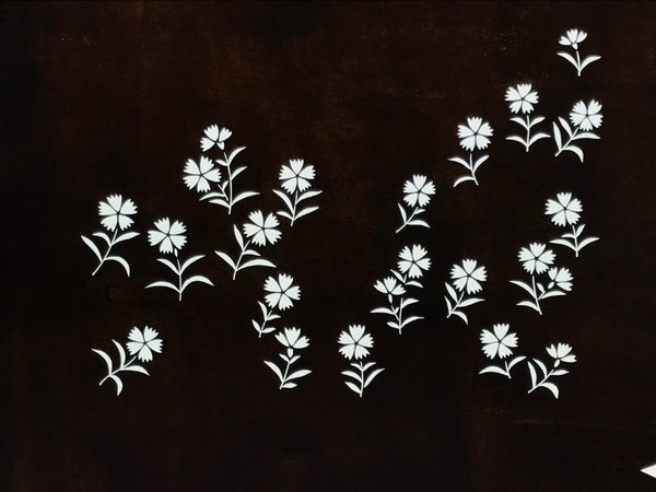 Using traditional mulberry washi paper, this katagami stencil with silk backing features a simple design of carnations (nadeshiko). Nadeshiko are said to symbolize maternal love. They are also associated with simple and pure beauty of Japanese women. **The front side of this katagami is a light tan color