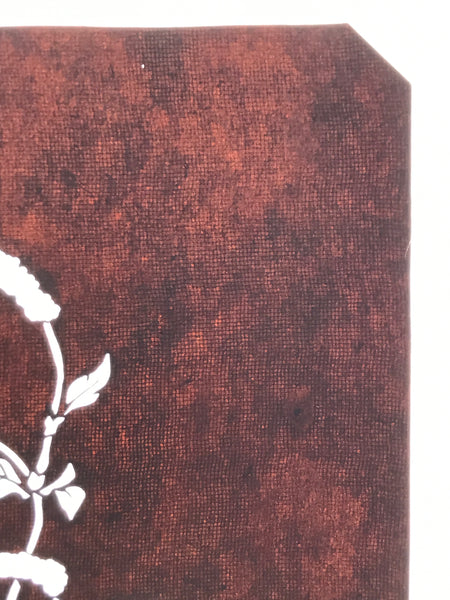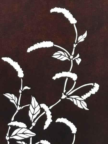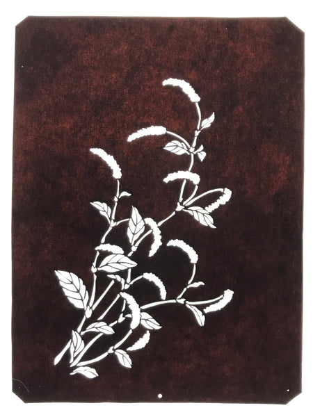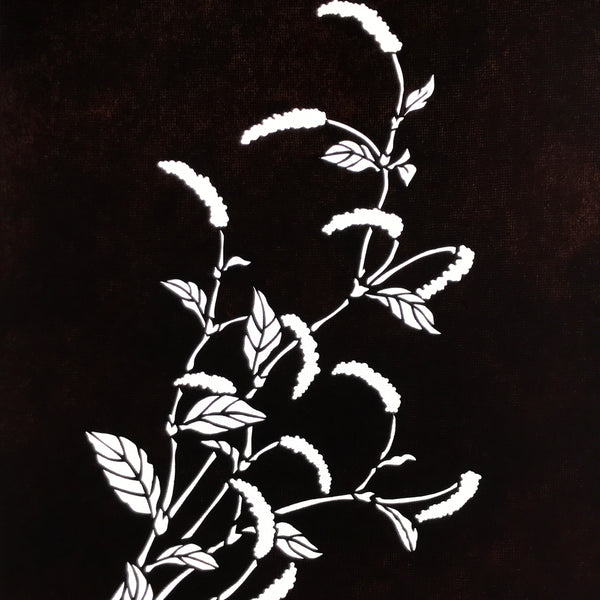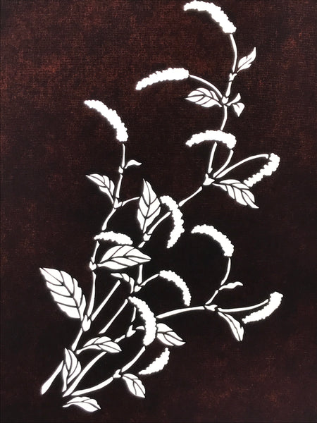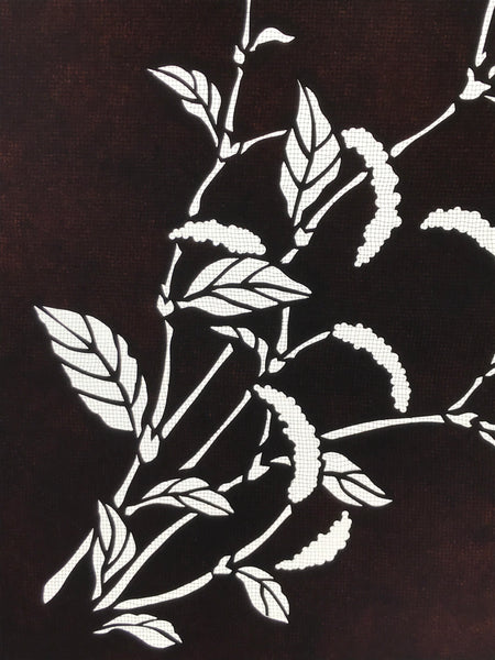 Using traditional mulberry washi paper, this katagami stencil with silk backing features a branch of a chenille plant, a tropical plant also known as benihimo no ki (red string tree).
