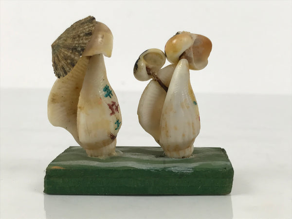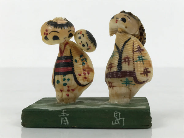 This vintage Japanese shell kokeshi figurine represents a family: parents with a baby, from Aoshima, Miyazaki. The figurine's face and the kimono pattern are painted. The figurines sit on a wooden stand with a wave-like design.  The stand has an inscription.