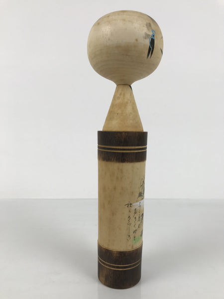 This vintage Japanese wooden kokeshi doll has a classic design (round head, cylindrical body). The body is straight with brown bands on the top and bottom. The shoulder is tapered with a thin neck and a wobbly head. It is painted with a Japanese poem, Waka, and its scenery with a pagoda, deer, trees, and a distant mountain. The facial expression is calm , eyes closed, and the tufts of hair with blue and white ribbons are painted. It has been brushed with a clear lacquer coating to give it shine.