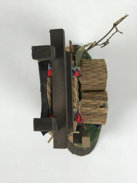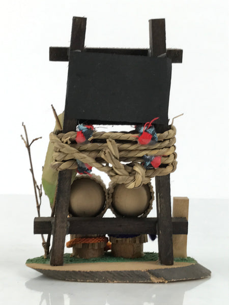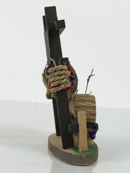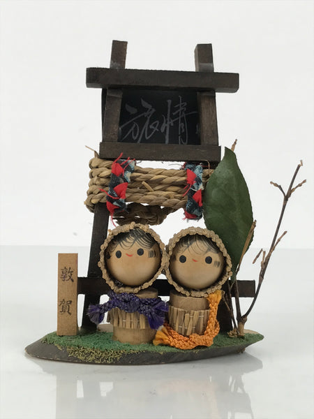 This is a vintage Japanese wooden doll figurine from Tsuruga, Fukui. It has two child figurines in a straw snow coat, a shrine-gate-style frame with a straw rope wrapped, and signs with Kanji characters on a wooden base. Half of the front of the base has a textured green surface.