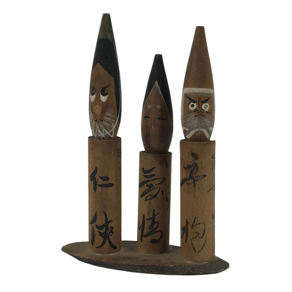 This is a vintage Japanese wooden doll figurine from Unaduki Hot Spring in Toyama. It has three brush-shaped wobbly-head figurines on a wooden stand. Each figurine has a Kanji Japanese word on its body and a facial expression that matches the word's meaning.