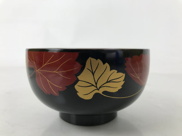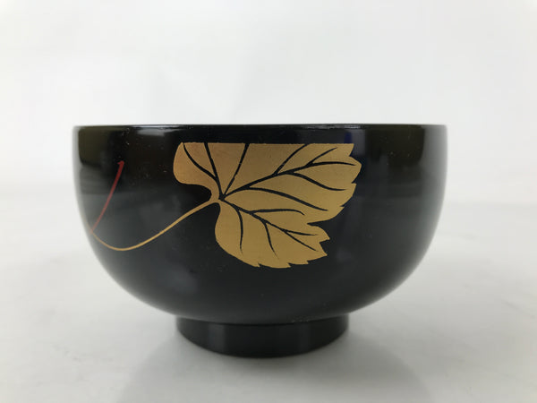 A glossy black lacquered bowl in the Aizu-Nuri style with a leafy motif makie outside and red inside, this vintage lacquered wooden bowl is a beautifully decorative addition to any traditional Japanese dinnerware set. This particular bowl is considered an owan, made for soups or rice. It is easy to hold while eating.