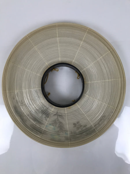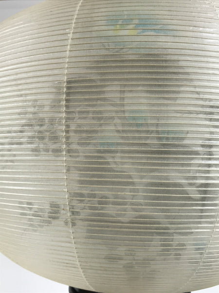 This is a vintage Japanese silk lantern. It has a double layer, with the inner layer decorated with a subtle design featuring black and blue Autumn flowers. The blue flowers might be fuyo flowers (a type of hibiscus). The lantern fits on a 3-legged black wooden stand. This type of lantern is usually used as a display during the Obon summer festival. This lantern flattens and is easily stored in the matching box.