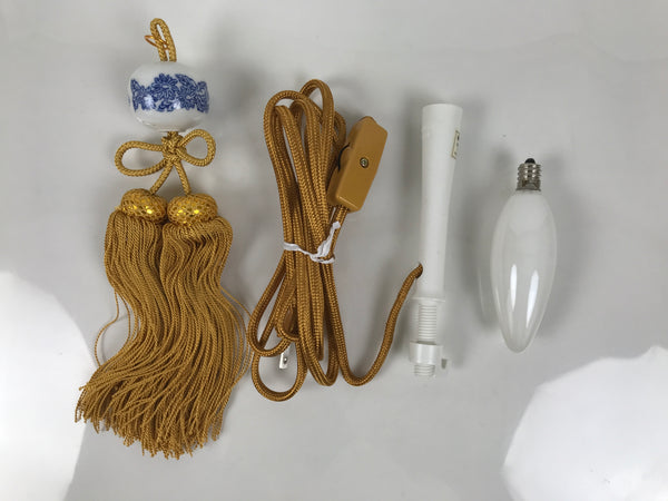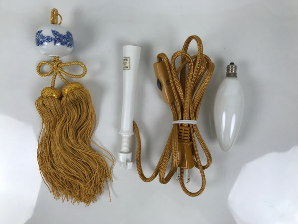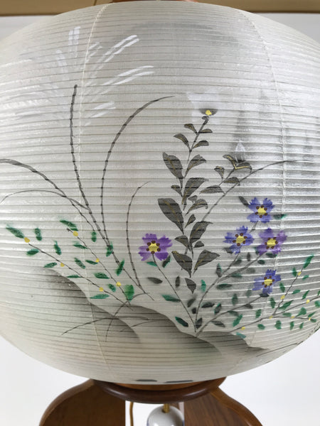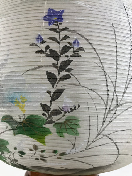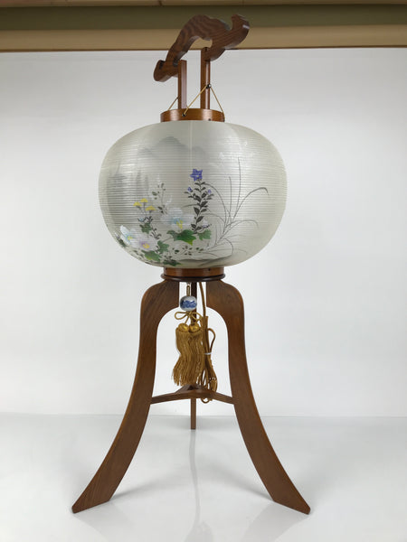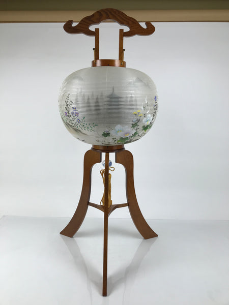 This is a vintage Japanese silk lantern, decorated with fuyo flowers (a type of hibiscus), purple kikyo bell flowers, and yellow flowers. The background features trees and a pagoda. The lantern fits on a 3-legged brown wooden stand. This type of lantern is usually used as a display during the Obon summer festival. This lantern flattens and is easily stored in the matching box.