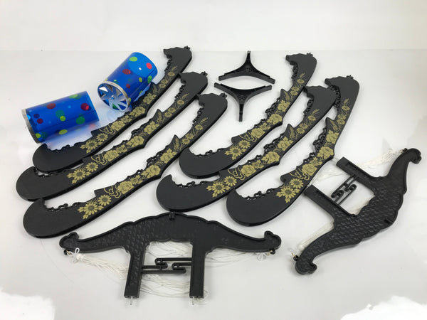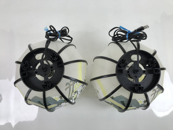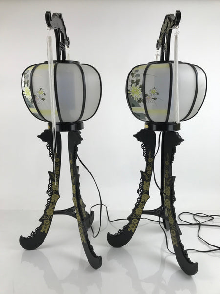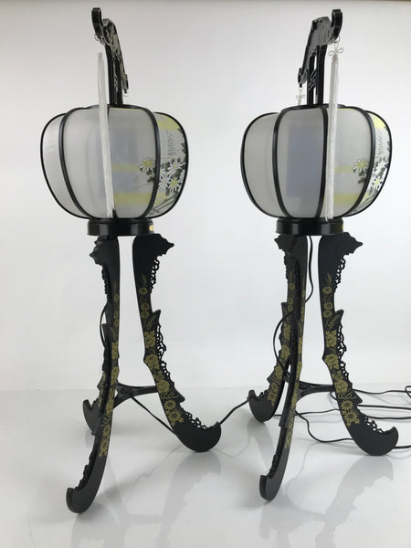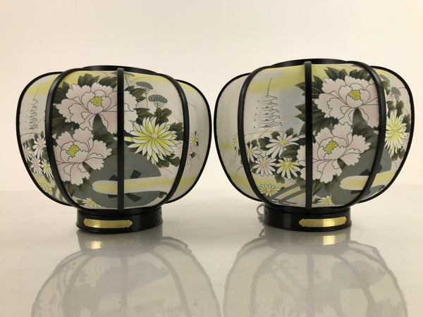 This is a vintage Japanese electric Ouchi lantern set of two. Ouchi lanterns are standing lanterns with three legs that are displayed during the summer Obon festival to commemorate ancestors. The synthetic fabric lanterns are white with large images of peonies, chrysamthemums, and a distant temple. They fit snuggly on their plain black plastic frames with gold designs. They fit semi-flat in the original box. They have electric lights with a plastic blue covering that spins when the lightbulb becomes warm. There are two long white tassels that hang from the top piece on each.