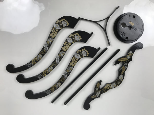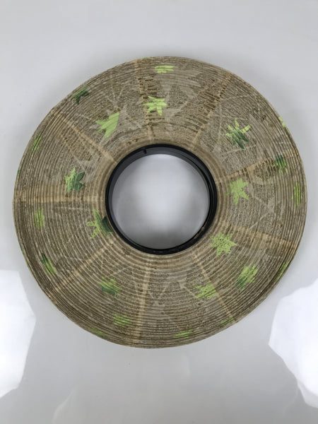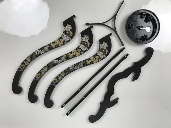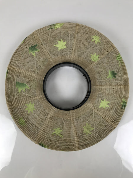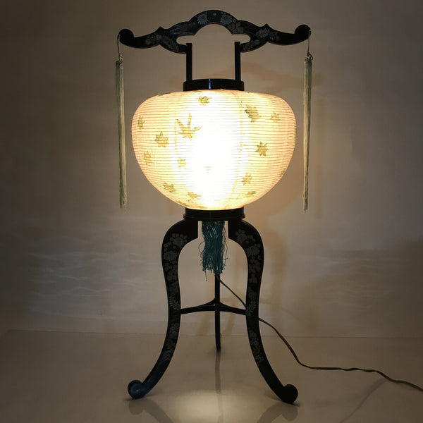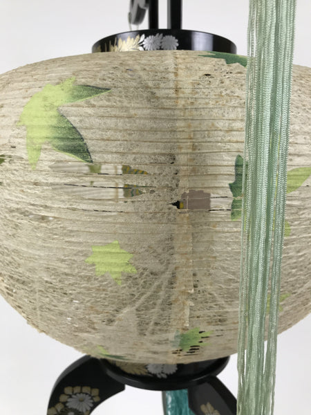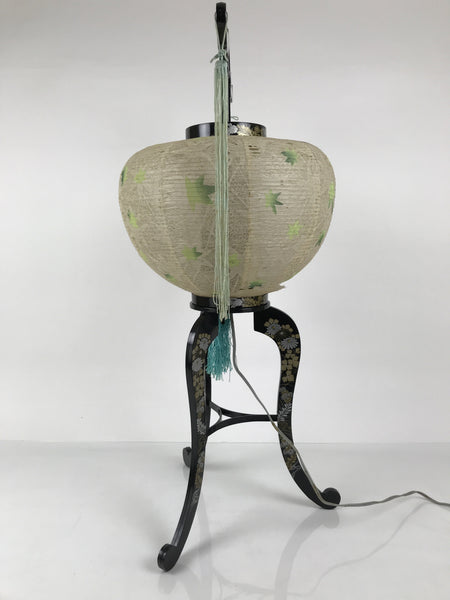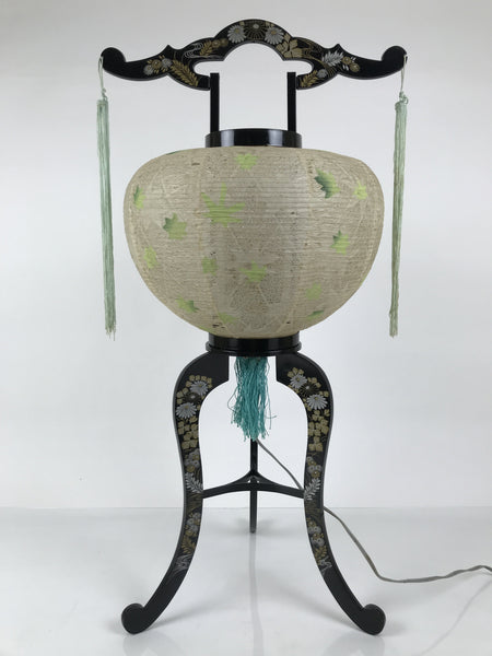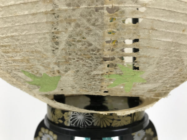This is a vintage Japanese paper lantern made from thin white washi paper, decorated with green leaves. It fits on a 3-legged black resin stand decorated with silver and gold chrysanthemums and other floral items. The inner lantern is white with a floral pattern painted in green, yellow, and red. It spins when the light bulb is on. This type of lantern is usually used as a display during the Obon summer festival. This lantern flattens and is easily stored in the matching box.