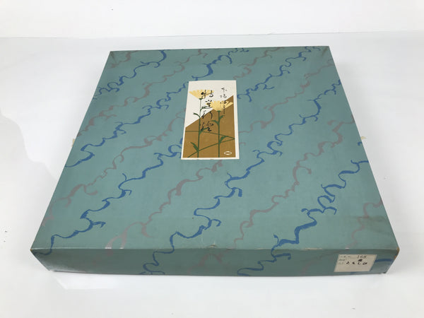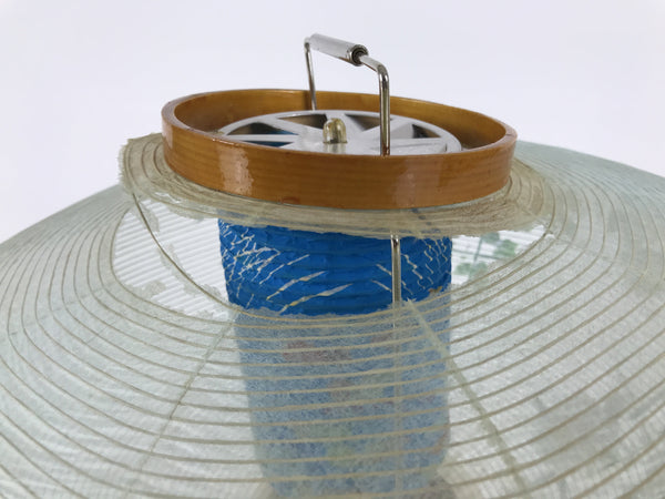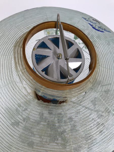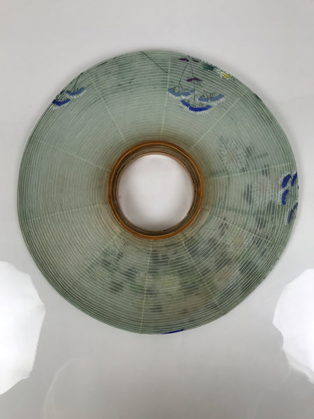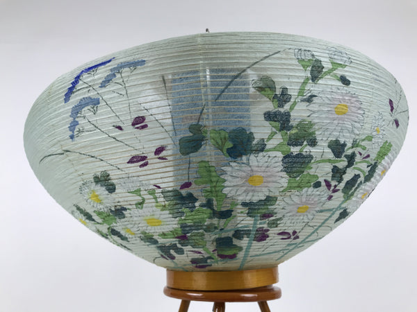 This is a vintage Japanese paper lantern made with thin light green washi paper, painted in color with flowers such as chrysanthemum. It fits on a 3-legged brown wooden stand. The inner lantern is blue with a floral pattern. This type of lantern is usually used as a display during the Obon summer festival. This lantern flattens and is easily stored in the matching box. Please note that the light bulb is NOT included. The lantern does not rotate.