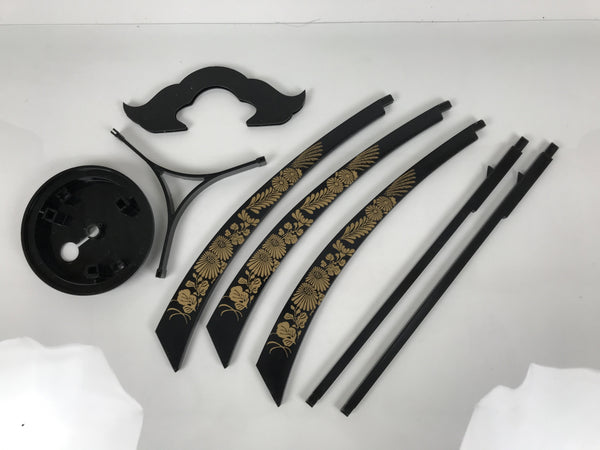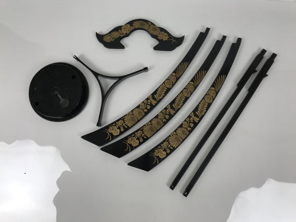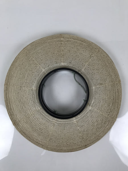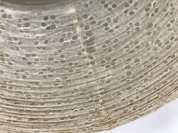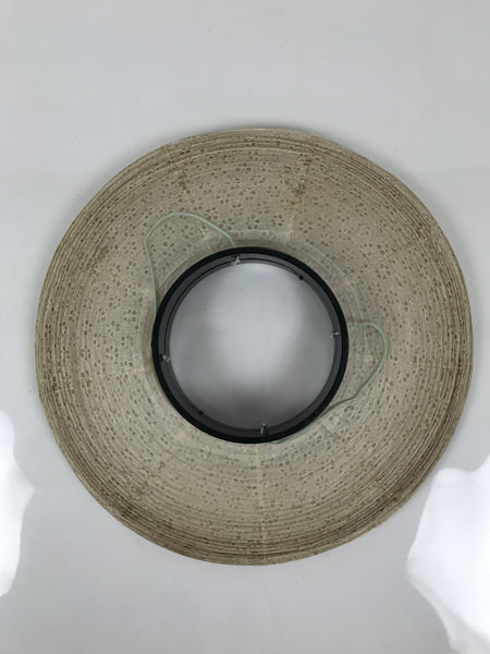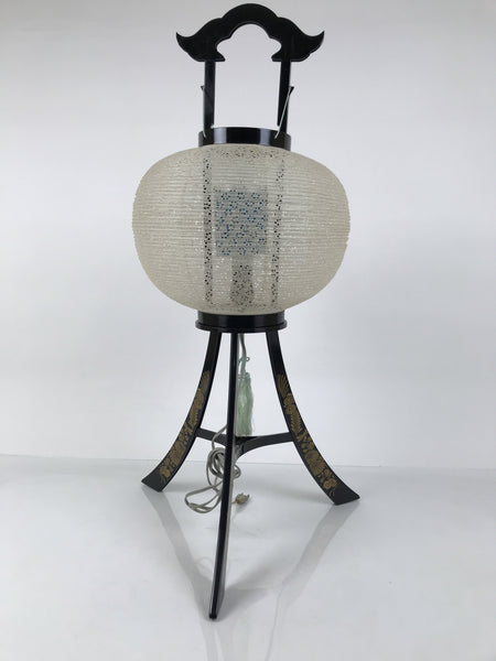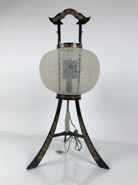 This is a vintage Japanese paper round lantern made with thin white washi paper, pierced all around to reveal a floral pattern. It fits on a 3-legged black resin stand decorated with gold chrysanthemum flowers. The inner lantern is blue. This type of lantern is usually used as a display during the Obon summer festival. This lantern flattens and is easily stored in the matching box.