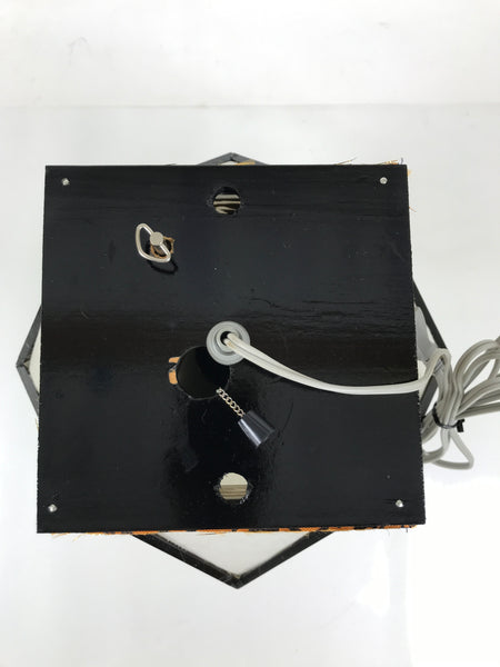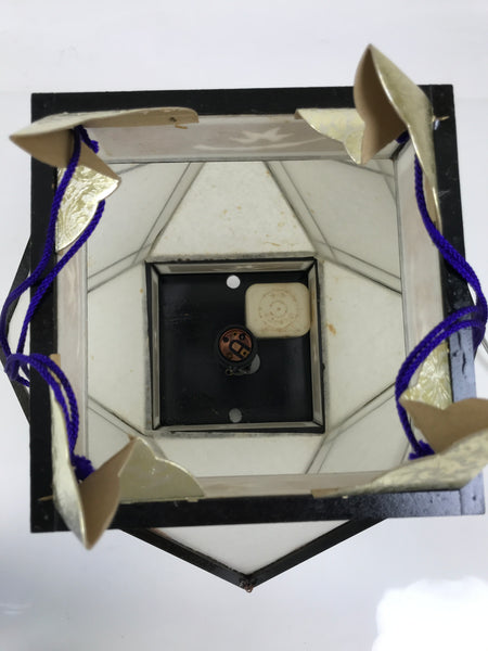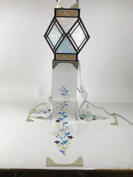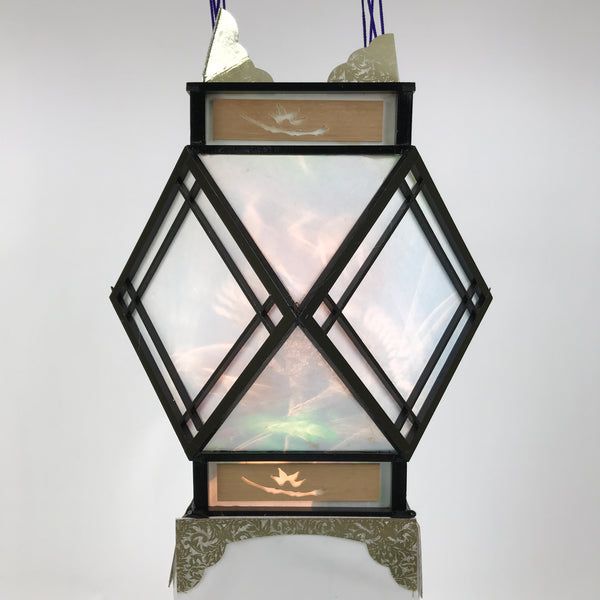 This is a vintage Japanese paper hanging electric lantern called chochin. This particular lantern is displayed during the summer obon festival. It is made with white washi paper with a wooden black frame. At the bottom, there are pieces of washi paper decorated with a floral pattern with kikyo bell flowers and chrysanthemum flowers. It lights up and projects a colorful floral pattern. This lantern comes in the original paper box with instructions in Japanese.