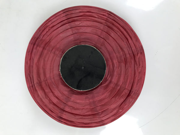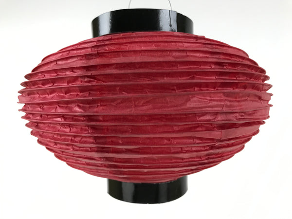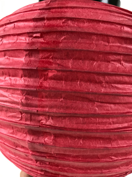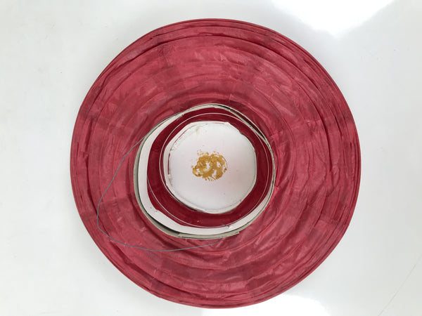 This is a vintage Japanese paper hanging lantern called chochin. This round lantern is made with thin red washi paper, a thin paper frame, and a wire handle. It has a candle holder on the inside.
