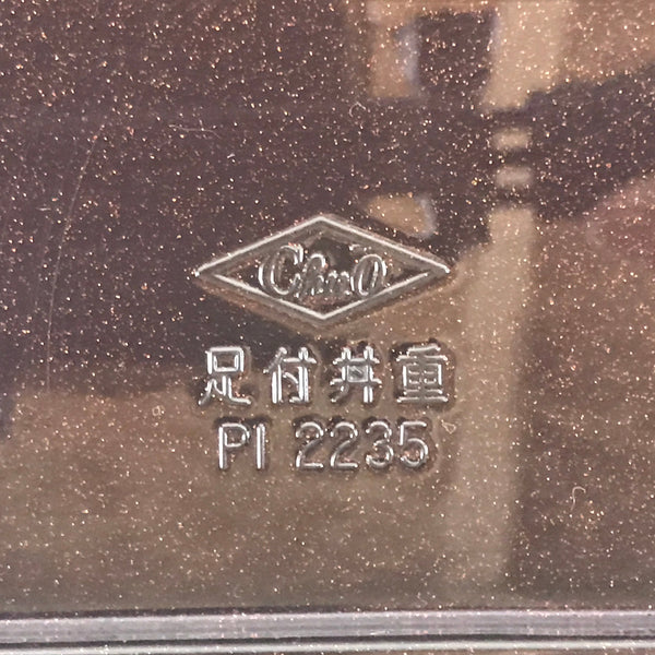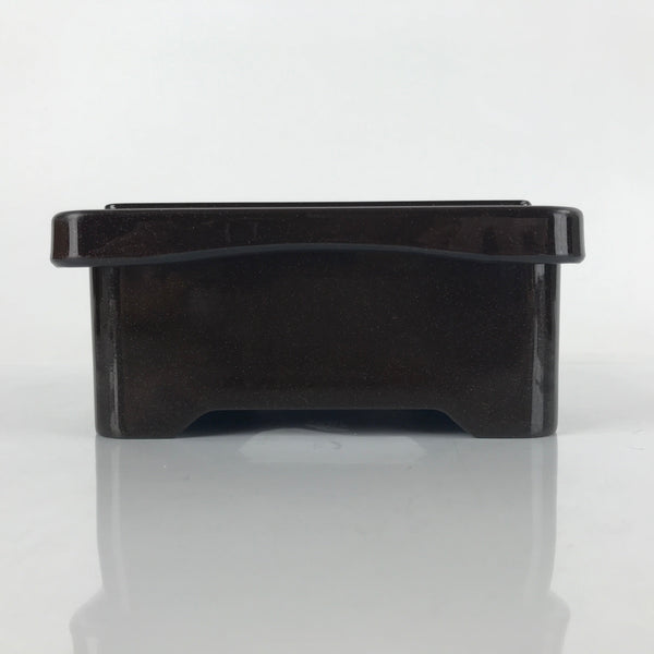 This is a vintage lidded Japanese bento lunch box. While made of sturdy resin plastic, this box is stylized to look like a traditional lacquerware bento box. It is brown with a coppery glitter. Inside is a classic simple red with a black edge. On the lid displays a replica makie design of vine flowers. It does not contain any partitions, however plastic wrappers and lettuce leaves are commonly used for that purpose.