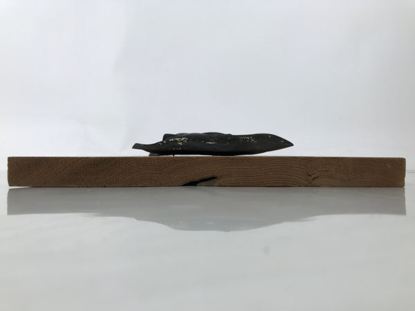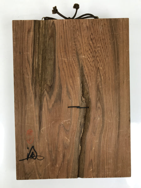 This vintage Japanese piece of wall hanging art features the face of a man. The mask is painted in black and attached by a wire to a solid wood panel. There are some characters on the top right. There is a string meant for hanging at the top. This piece is signed on the back.