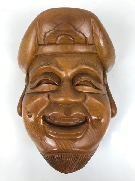 This is a vintage Japanese carved wooden mask (omen) of Ebisu, one of the Seven Lucky Gods. It is a medium brown color with a brushed clear lacquer finish. There is a purple braided cord stapled to the back for easy hanging.