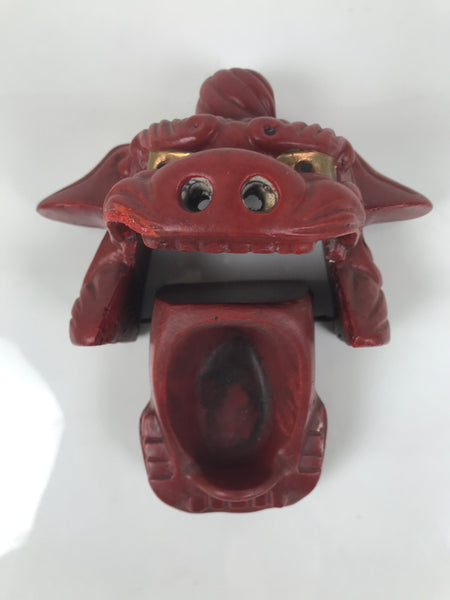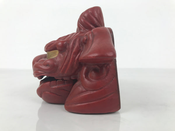 This is a vintage Japanese clay shishi lion mask. It is painted a deep red color with gold eyes. The mouth opens all the way to reveal a small spot for storing name seals/stamps, keys, or any other small item that can fit inside.