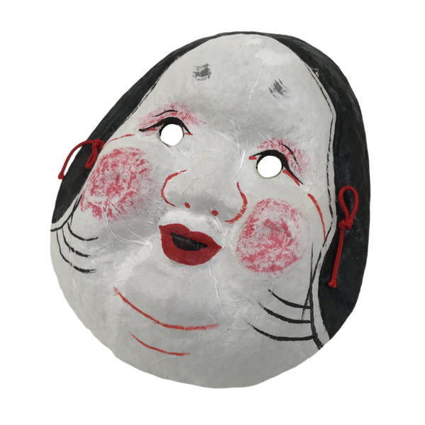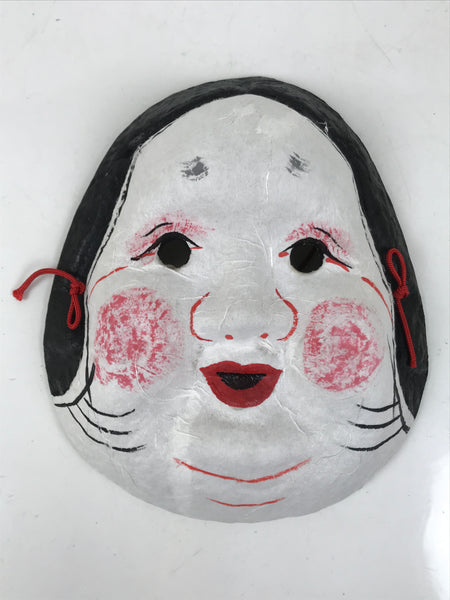 This is a vintage Japanese paper mache noh mask (noh-men). This character is the face of a woman named Okame or Otafuku. Okame is a smiling woman with a round face, a low and round nose, drooping hair, and round and protruding cheeks (high cheeks). She is said to bring happiness and good fortune to any man she marries. The mask is fully painted in white, black, and red. It can be used for all kinds of home and office decor.