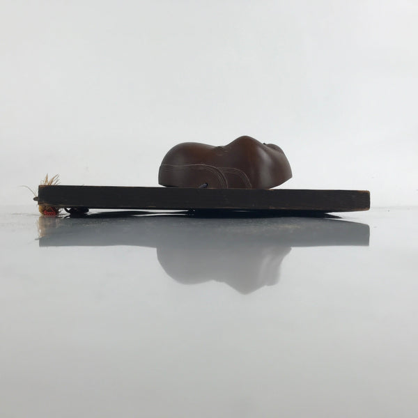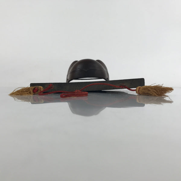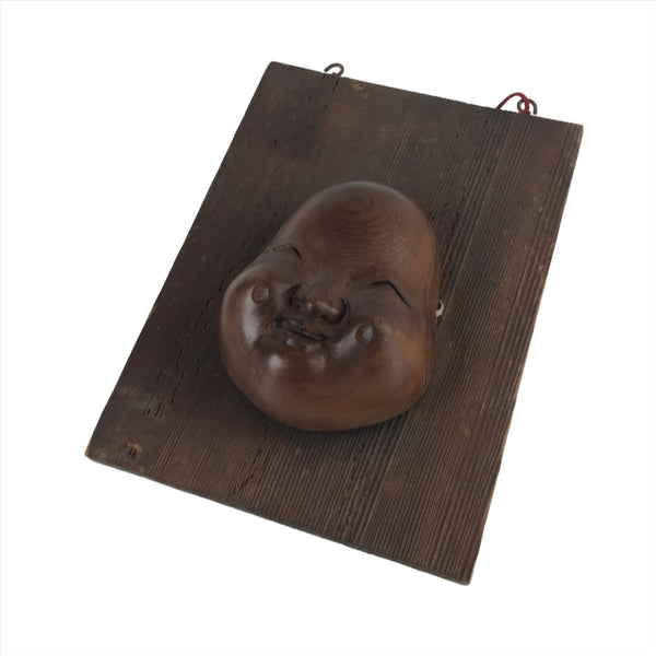 This is a vintage Japanese wooden noh mask (noh-men) attached to a wooden board. This character is the face of a woman named Okame or Otafuku. Okame is a smiling woman with a round face, a low and round nose, drooping hair, and round and protruding cheeks (high cheeks). She is said to bring happiness and good fortune to any man she marries. This mask has two light brown tassels and a red corn for hanging. It can be used for all kinds of home and office decor.