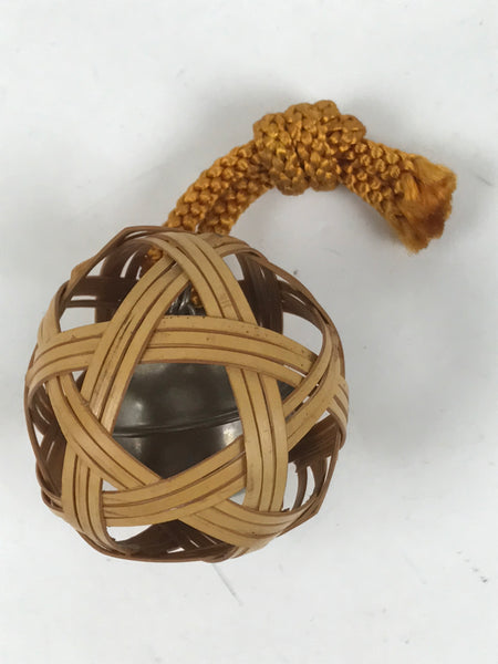 Japanese Handwoven Bamboo Metal Bell Amulet Vtg Mutsume Ami Sphere Brown JK872