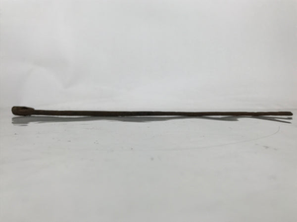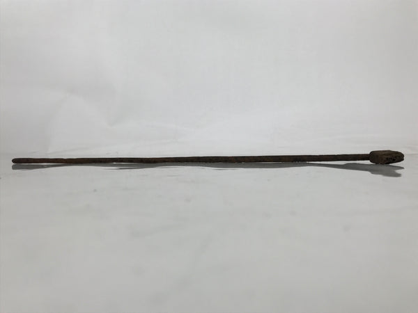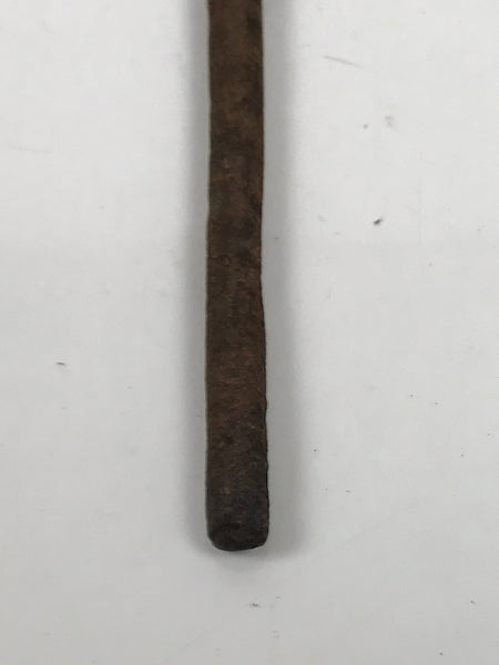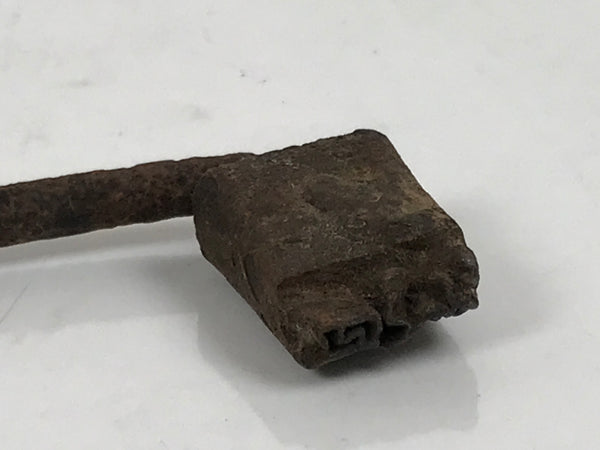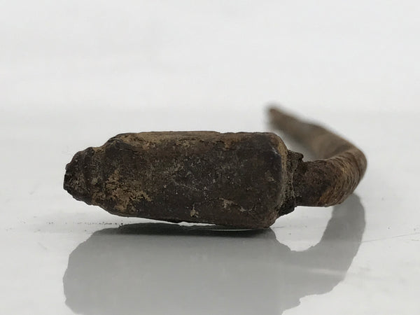 This is a vintage cast iron branding stamp called yaki-in. This piece is meant to be placed over fire or coals and is used to mark wood, leather, fabrics, and, most famously, Japanese sweets such as manju. It has small vertical kanji. It is unclear what exactly the top character is (perhaps き or を) but the bottom is likely ん日.